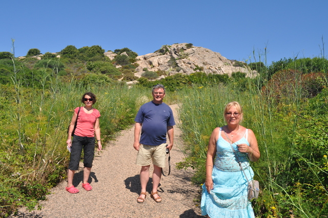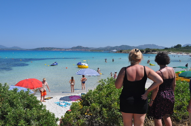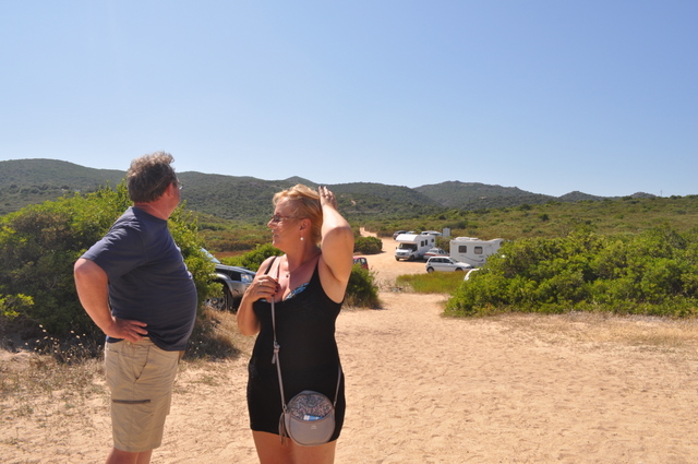Kasy biletowe otwarto o 8.00. Cena promu astronomiczna w przeliczeniu na dystans jaki mieliśmy do pokonania /ok. 80 euro za kamperka plus 2 osoby/. Ok. 9.00 wjeżdżamy na prom. Jeszcze rzut oka na Korsykę i po niespełna godzinie lądujemy w porcie Santa Teresa de Gallura na Sardynii. Jak zwykle kierujemy się do centrum miasteczka. Centrum niestety objęte zakazem parkowania kamperków. Parkujemy na jednej z bocznych uliczek nieopodal centrum i piechotką zwiedzamy okolice i miasteczko. Jesteśmy zaszokowani tym co widzimy. Czyściutko, piękne i zadbane budynki wokół, a my nastawialiśmy się na południowo-włoski porządek. Wdrapujemy się na pobliskie wzgórze, a dalej idąc w kierunku centrum mijamy piękne zabudowania tonące w kwiatach. Ryneczek, handlowa uliczka i sklepik z sardyńskimi specjałami padają kolejno łupem naszych oczu i pań. W sklepiku z miejscowymi wyrobami wesoła pogawędka z przemiłą sprzedawczynią połączona z degustacją wszystkich tubylczych przysmaków. Zakupiwszy kawałeczek dojrzewającej szyneczki wróciliśmy do kamperków. Capo Testa to kolejny cel naszej podróży. Przylądek na północy Sardynii, nieopodal Santa Tersa to wspaniały punkt widokowy,. Sobota to dzień wolny od pracy i miejsce to oblegane było przez tubylców. Mogliśmy jedynie przyjrzeć się widokom z kamperków. Zmęczeni upałem udaliśmy się w dalszą drogę w kierunku Costa Smeralda, w poszukiwaniu plaży i miejsca na nocleg. Jedziemy przez Arzachena, San Pantaleo by dotrzeć na plażę w okolicy Spaggia Rama di Junco. Kąpiel, plaża i odpoczynek dopełniły nasze wrażenia tego dnia.