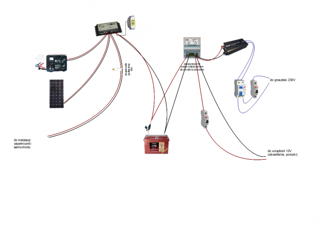 EDIT: Cały układ (oprócz akumulatora) powinien się zmieścić w jednej skrzynce w "rozdzielni". Dobrze będzie jeszcze sprawdzić, czy solar i prostownik mają diody zabezpieczające i dodać w razie potrzeby (to koszt rzędu kilku złotych).