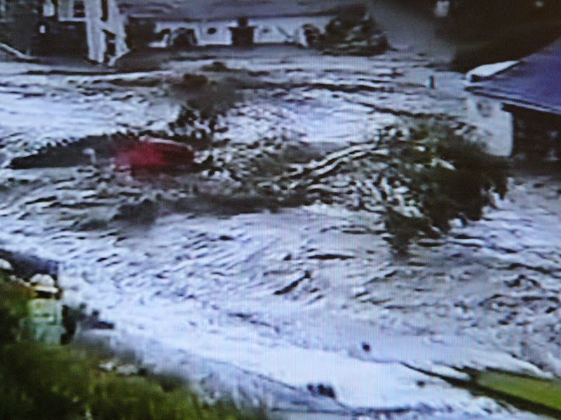 Tu widać jak wysoki już jest poziom. Teraz samochody przenoszone są nad mostami. Woda zaczyna zabierać domy.