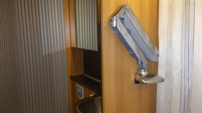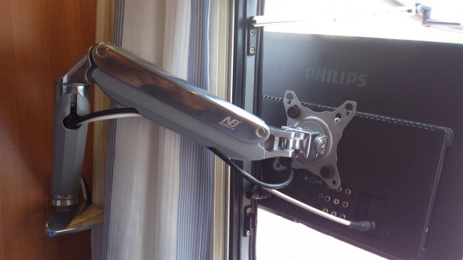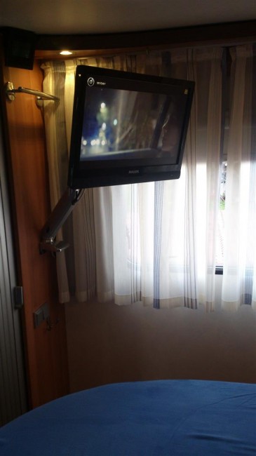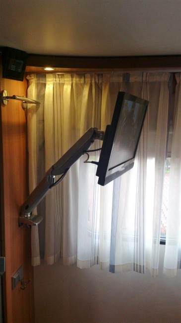 Poniżej przedstawię, moim zdaniem ciekawe rozwiązanie, mocowania TV w kamperze, za pomocą wysięgnika ze sprężyną gazową, przestawiony monitor do jakiejkolwiek pozycji zatrzymuje się bez mocowania. Zawsze miałem problem z przenoszeniem monitora, bo wieczorkiem chciałem oglądać telewizję pod markizą a później jeszcze użyć go jako usypiacza w sypialni. Orginalne mocowanie wykonane przez Hymera, wyjeżdżające z szafki w saloniku w moim przypadku jest mało praktyczne, owszem pozostanie, bo przełożenie telewizora na stare miejsce to minuta roboty a dołożyłem rozdzielacz sygnału, więc mogę nawet trzy telewizory podłączyć. Poniższe zdjęcia na życzenie kolegi profesora pokażą jak to działa.