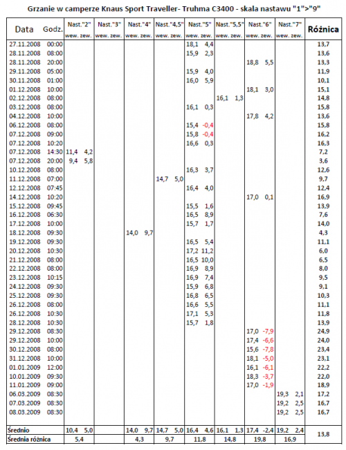 W górnym wierszu masz nastawy grzania w skali od 1 do 9. Dotyczy kampera Knaus Sport Traveller 500D, a więc nieduży. Pomiary doykonywane przez ponad miesiąc w grudniu 2008 w Irlandii. Więc zima nie była zbyt mroźna.