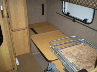 Jak obiecałem uzupełniam dolny wymiar to 40cm przy wysokości sypialni 180cm. Podłoga nie jest obniżana. Spania są wzdłuż samochodu, w schowku mieści się część nadkola, oraz inne graty. Po złożeniu dolnego spania jest dwuosobowy stolik. Górne spanie wisi na zawiasach i można go złożyć jak kuszetkę. Mam zdjęcia spania, jak je zmnijszę to wstawię do postu.