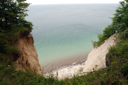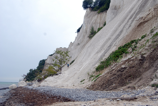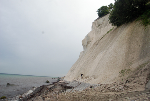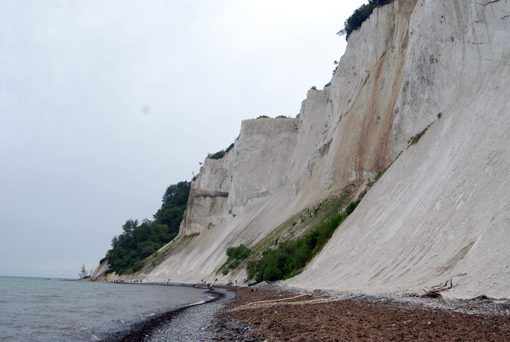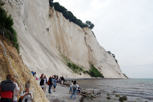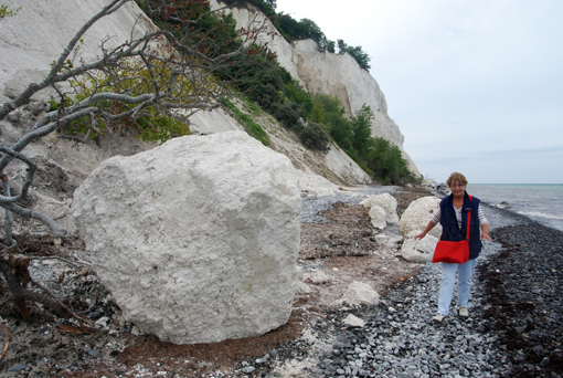 Idziemy brzegiem urwiska ok. 1300 m. Potem trzeba długo schodzić skosem schodami w dół. Widok z dołu jest imponujący. Wysokie kredowe ściany. Wszyscy zwiedzający szukają amonitów, które podobno znajduje się tu bardzo często. Jedni na brzegu, inni wydłubują z kredy. Przechodzimy brzegiem morza 1300 m i… zaczynamy się wspinać schodami w górę. Idziemy, idziemy i… końca nie widać. Tych stopni jest ponad 400. Na szczęście są po drodze małe platformy z ławkami, gdzie można odpocząć. A korzystają z nich prawie wszyscy. Różnica między poziomem morza a szczytem wzgórza to 130 m. Idzie się prawie pionowo. Decha zapiera. Wreszcie stajemy na górze. Czym prędzej do kampera. I kawa. Plus znakomite duńskie makaroniki. 0,5 kg za 5 DKK. Kupiliśmy ich parę paczek i znikały w szybkim tempie.
