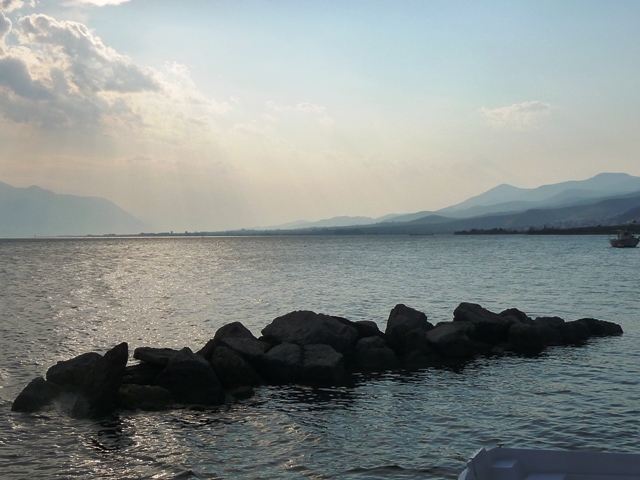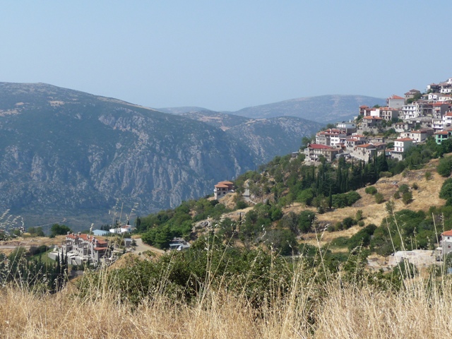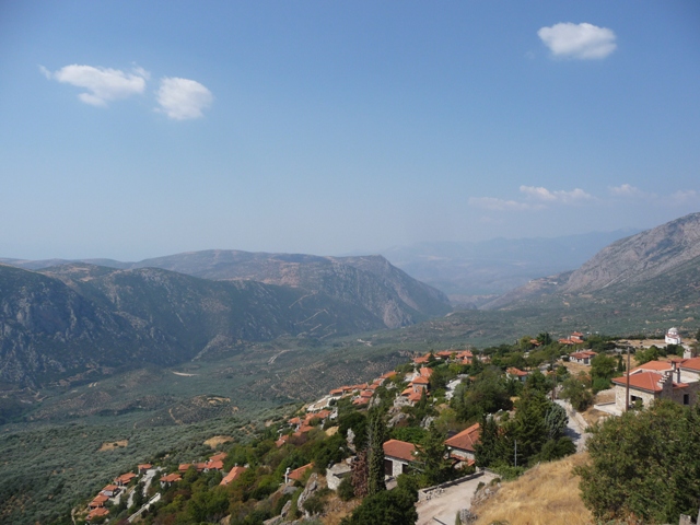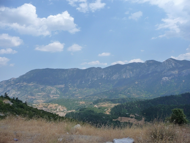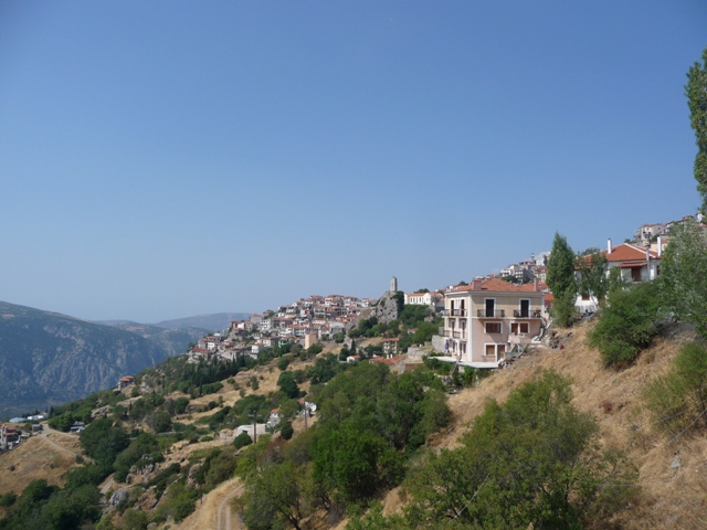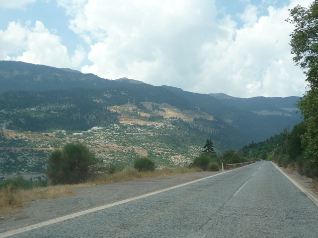 Trzymamy się jednak wybrzeża. Przez góry (wąskie drogi, miejscami już na wybrzeżu uszkodzone) docieramy znów do Zatoki Korynckiej. Jest tu kilka wiosek jednak widokowo ta część nie zachęca. Dopiero w Psatha jest lepsze miejsce do zatrzymania się na chwilę. Za nią stromy podjazd i przedostajemy się do Thivy (dawne Teby). Dalej znów główną do Livadia u stóp Parnasu. Skąd długimi podjazdami docieramy do Arachova – coś w stylu Zakopanego, ale w lecie raczej pusto. Roztaczają się stąd widoki zarówno na Parnas (ok. 2500 m) jak i okolice.