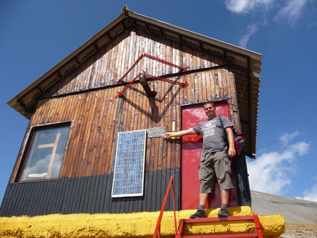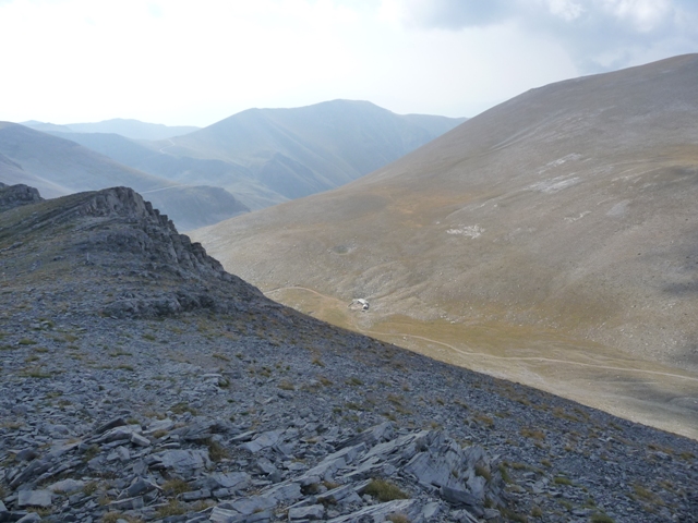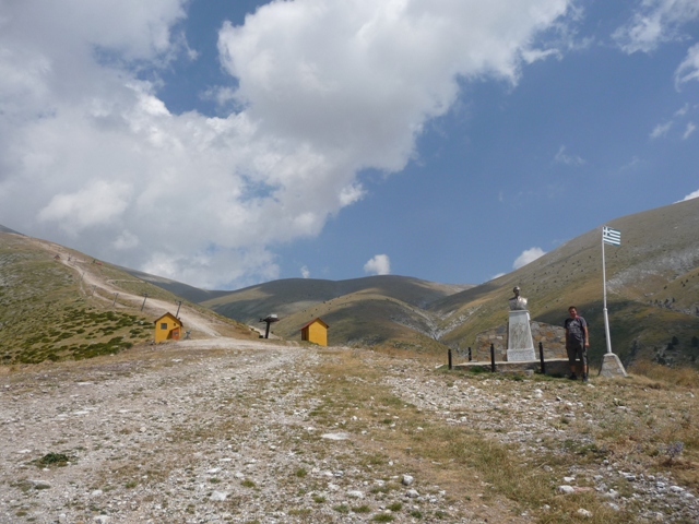 Wjeżdżamy na wysokość 1700 metrów i w pewnym momencie wyłaniają się domki – czyli ok. znak przecież pokazywał, że tędy do schroniska. Tak, tylko te domki okazały się koszarami. Podchodzimy – z ich angielskim słabo, my po grecku to frape umiemy zamówić :D . Mówią, że „that way with car” to się nie da – patrzymy faktycznie ciężko by było – szuter z kamieniami nachylenie koło 25 procent. Ale chodziło im w końcu, że musimy mieć specjalną kartę – na szczęście wystarczy na miejscu spisanie danych i podpisanie oświadczenia, że będziemy grzeczni w górach nie będziemy schodzić ze szlaku i wrócimy o czasie