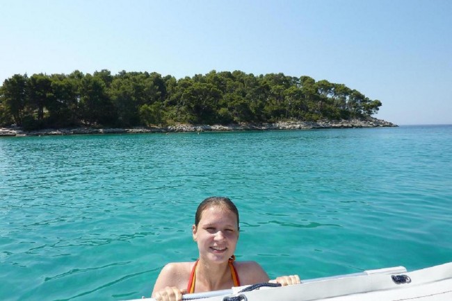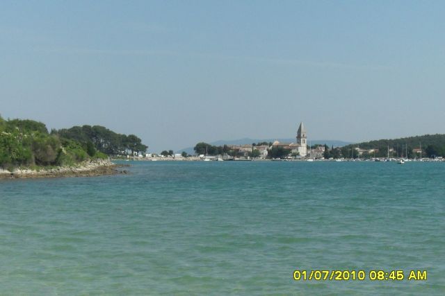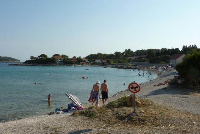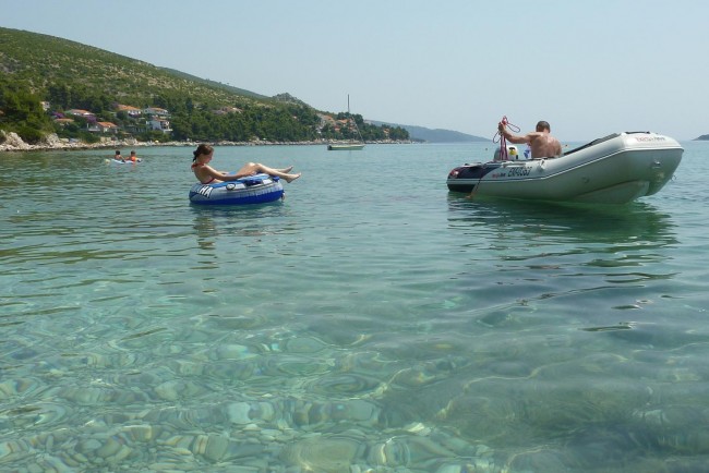 Woda w morzu ma przejrzystość na 15 m w dół. Miałem echosondę więc głębokość mogłem kontrolować dokładnie i dopiero na 17 metrach dno stawało się nierozpoznawalne. Nie spotkałem osobiście do tej pory w Chorwacji tak czystej wody. Są skaliste zatoczki i wyspy do których wytrwali mogą pokusić się o dopłynięcie wpław. W pobliżu znaleźć można „lwią skałkę” z której wypoczywający skaczą sobie do wody.