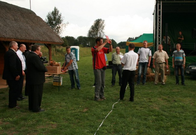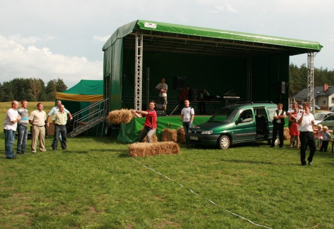 Po występie kabaretu rozpoczęły się konkursy sprawnościowe dla panów i pań. Dla panów był to konkurs rzutu na odległość sprasowanym snopkiem siana. Do konkursu miał prawo przystąpić także ktoś z gości, czyli jeden z nas. Zgłosił się Maciek. Na co dzień postawny i sympatyczny dentysta z Wrocławia, miał się zmierzyć z miejscowymi w konkurencji, w której nigdy nie brał udziału, podczas gdy oni już startowali i to nieraz.