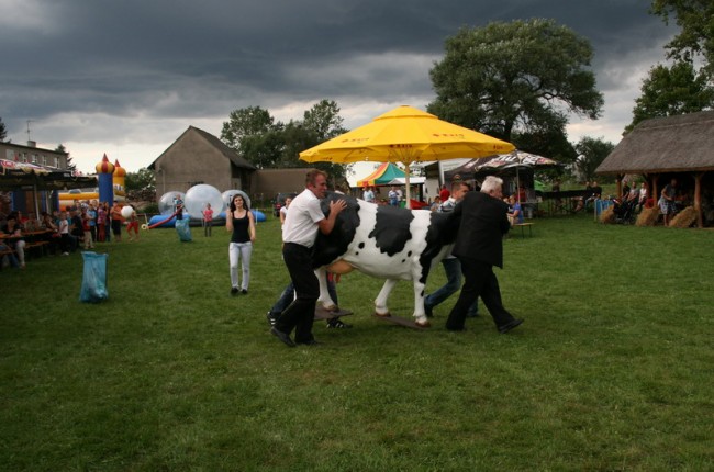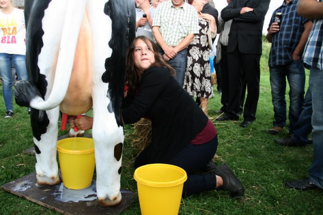 Konkurencja dojenia wywoływała u zebranych gapiów duże emocje nie mówiąc już o tych, którym ulegały same zawodniczki. To było widać na ich twarzach. Niektóre panie miały rzeczywiście wprawę w dojeniu. Potrafiły wyciągnąć z tej krowy do dwóch litrów mleka. Nie bacząc na kreacje, ochoczo klękały na kolanach i energicznie brały się do dzieła przy aplauzie i chichocie tłumu.