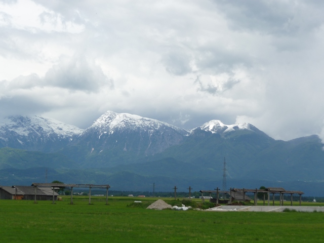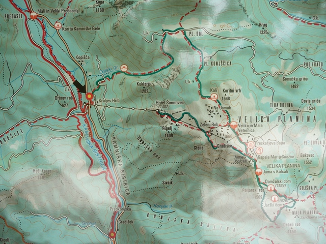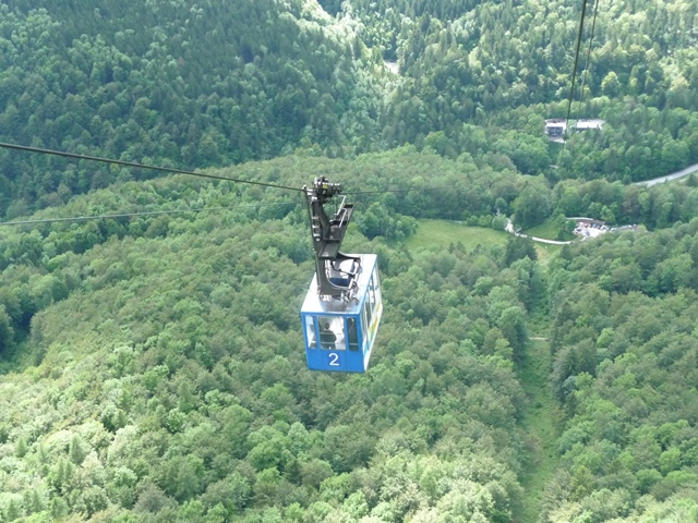Kolejnym naszym celem „przelotowym” jest Kranj – nawet nie wjeżdżamy do miasta, mijamy je obwodnicą i jedziemy w końcu w konkretne góry    Przed nami Kamnik, a właściwie Kamniska Bistrica, gdzie znajduje się kolejka na Vieliką Planinę. Po minięciu Kamnika jedziemy cały czas na północ, mijamy parking po lewej stronie i po kilku kilometrach pojawia się napis camping. Nic szczególnego – nawet nie wskazuje, że może tu być coś ciekawego. Zatem jedziemy dalej. Na końcu drogi jest parking – to pewnie tu, choć kolejki nie widać. Pytamy się – okazuje się, że kolejka jeździ spod „campingu”. Wracamy zatem. Camping to raczej pole namiotowe wśród drzew, pamiętające jeszcze stareńkie dzieje. Raczej nie dla camperów choć można stanąć na pobliskim parkingu. Stacja kolejki też trochę jakby pamiętająca dawne dzieje. Kolejki nie widać. Bilet tam i z powrotem wywożący na 1260m kosztuje 11 euro, a w połączeniu z kolejką krzesełkową na szczyt to 16 euro.