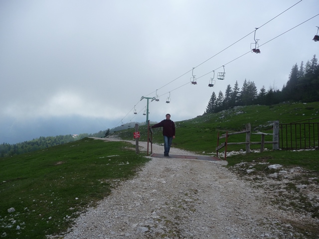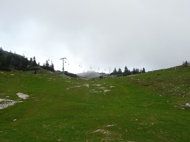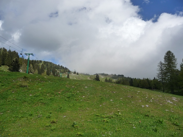 Mimo różnicy poziomów 400m „spacerowym” krokiem można to zrobić w ciągu 1 godziny, gdyż odległość na szczyt nie jest wielka. Jest kilka dróg na szczyt – oznakowanie słabe – na wyczucie, ale szczyt i kolejkę krzesełkową widać cały czas więc zgubić się trudno. Wdrapujemy się zatem – z każdym metrem widoki coraz ciekawsze – i coraz ciekawsza pogoda – pojawiają się chmurki – przychodzą i odchodzą.