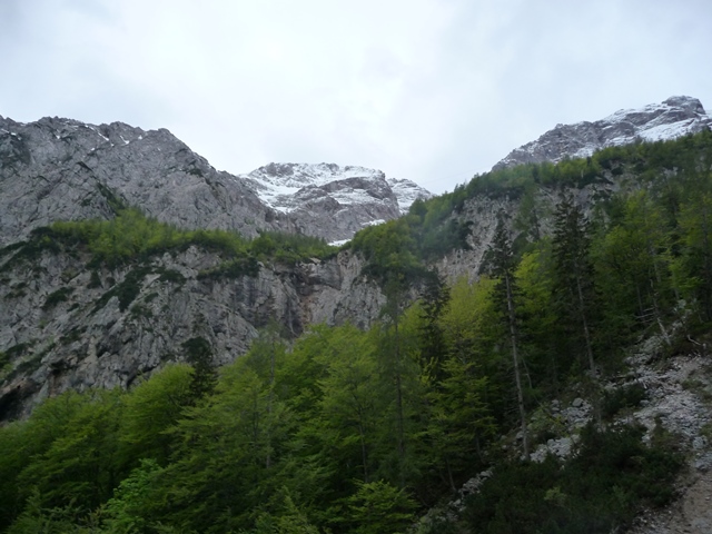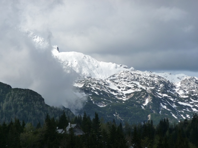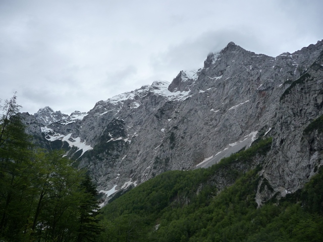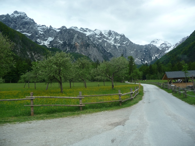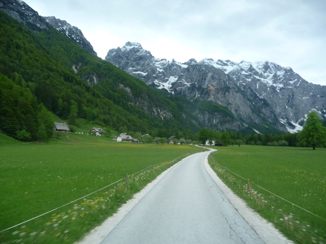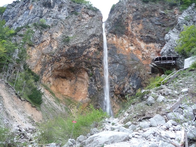 Zamarzyła nam się jeszcze Logarska Dolina. Niestety trzeba znacznie nadłożyć drogi, ale skoro tu już jesteśmy to jedziemy. Wracamy przez Kamnik, dalej na Luce, by po kilkudziesięciu kilometrach znaleźć stellplatz (po lewej stronie tuż przed skrętem na Logarska Dolinę, jest WC i zbieg strumieni). Jednak jesteśmy sami, w promieniu wzroku żywego ducha to raczej nie zostajemy na noc,  wjeżdżamy do doliny. Droga ciągnie się i ciągnie, przed nami co jakiś czas pojawiają się majestatyczne góry pokryte śniegiem. Mijamy jakieś domy, a ponieważ droga ciągnie się dalej to jedziemy. Po drodze jest jeden mostek w remoncie, ale da się przejechać. Jedziemy cały czas wzdłuż strumienia tak naprawdę o tym nie wiedząc, gdyż jest on zupełnie wyschnięty – czyżby zimy w tym roku nie było?    Po kilku kilometrach jazdy leśną drogą (jest asfalt) docieramy do parkingu z pętelką. To właśnie stąd trzeba podejść jeszcze z 15 minut do największego wodospadu (około 100m). W całej dolinie podobno jest ich 20 my widzieliśmy tylko ten jeden. Przy wodospadzie przycupnęła knajpka, z której można podziwiać widoki. Wodospad owszem jest, ale w tym roku jakoś tak słabo szumi. Pętelka na końcu drogi się wyludnia, zatem zjeżdżamy i my w nadziei, że może ktoś jednak stoi na stellplatzu – niestety pustki. Decydujemy się więc na wjazd do Austrii, by stanąć w pierwszej napotkanej wiosce, w końcu to raptem 20km. Podjeżdżamy na przełęcz, droga dość dobra, ale wspinaczki sporo. W międzyczasie zdążył już zapaść zmrok, zaczęło lać jak z cebra no i zaczęło się robić ciekawie. Lubimy serpentynki, ale to miejsce jest szczególne – na 5km obniżamy się około 800m, wąsko, stromo, leje, na drodze tu i ówdzie glina, czasem jakaś kłoda na drodze… brrrrr, chyba to najgorsza drogą jaką jechaliśmy – szczere odradzamy. Pewnie w dzień widoki cudne, ale wrażenia z nocnej jazdy – brrrr.    Pierwsza miejscowość, nie ma gdzie stanąć, kolejna podobnie….. jedziemy dalej, nawigacja się gubi, wskazuje, że tą drogą nigdzie nie dojedziemy – wracamy na stację się zapytać – mówią, że dobrze jedziemy – ehhh uwielbiam nocne jazdy, zwłaszcza jak się składa literki czytając nazwy miejscowości. Na szczęście droga już lepsza – szersza więc jechać się da. W strugach ulewnego deszczu docieramy aż do Klagenfurtu – pierwsza lepsza stacja benzynowa jest nasza – oj gdybyśmy wiedzieli, że będzie to tak wyglądać….