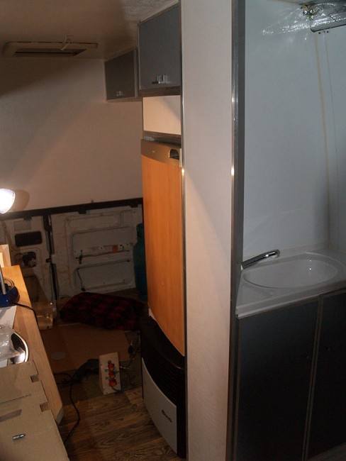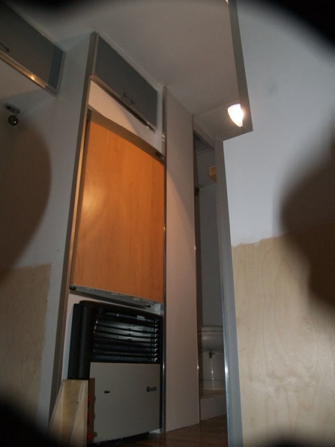 Truma, lodówka, następnie taka 17cm ścianka - pomyślałem sobie, że tam fajnie by się komponowały wszystkie wskaźniki i inne pokazywaczki. Co tam będzie dokładnie to nie wiem, ale jeden już mam. Wskaźnik od ładowania aku przez solara. Na górze jest kolejna szafeczka i tam dzisiaj zrobiłem przejście przez dach i obsadziłem kominek do trumy. Kurcze gdybym miał 0,5m komina więcej to już by wszystko ładnie siedziało.