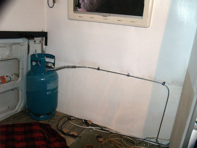 Zacząłem też robić instalację gazową. Lodówka podłączona, stojak na zawory zrobione, podejście do butlo także. Jutro wygnę rurkę do kuchenki gazowej i do trumy. Instalację mam poprowadzoną wewnątrz auta, a tylko do trumy będzie pod bo i tam jest podejście gazu.