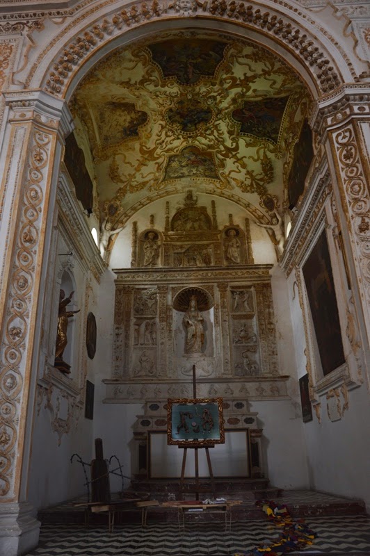 Rzut oka na mapę – o w promieniu kilku kilometrów zazaczono punkt widokowy i Klasztor San Calogero (37.51951, 13.11286). Jedziemy – nisko nie jest (prawie 400m), ale stromo (poza miastem) też nie. Kiedyś kiedyś był tu mały kościół, poniżej jaskinia z której korzystał święty. Z czasem stało się to miejsce pielgrzymek, mnisi założyli tu szpital i wybudowali nowy kościół na przełomie XVI/XVII wieku. Obecnie kościół należy do Zakonu Franciszkanów. Można praktycznie podjechać pod same drzwi kościoła – jest tam parking na może 20 aut. Gdy obawiamy się braku miejsc – poniżej można stanąc przy drodze. Jedno z nielicznych praktycznie pustych miejsc dzisiejszego dnia.