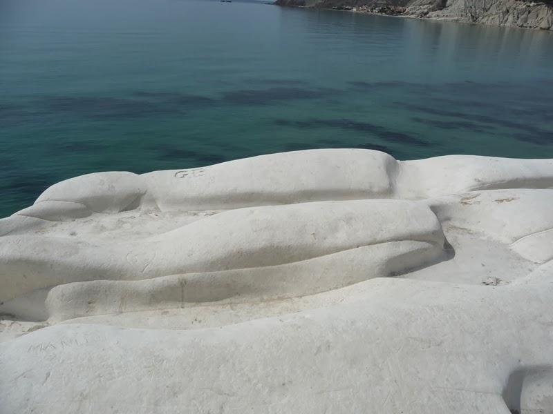 Po kilku minutach już wiemy dlaczego woda jest obowiązkowo. Schody to mniej więcej 90 metrowy klif. Wiatru zero, upał niesamowity oddycha się ciężko. Na dole można coś kupić cena pół litrowa butelka wody to jedynie 5 euro. Niemniej mimo tych niewygód warto. Zza zakrętu wyłaniają się śnieżnobiałe skały (jak w Pamukkale) Dzięki swej niepowtarzalności plaża wpisana jest na listę UNESCO. Nie jest to jednak wymarzone miejsce na plażowanie. Na białych kamieniach temperatura sięga zenitu. Do morza też nie ma łatwego zasięgu, a biały kolor pozostaje na wszystkim. Niemniej widoki niesamowite.
