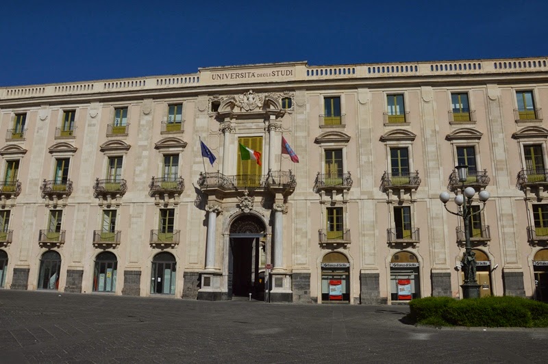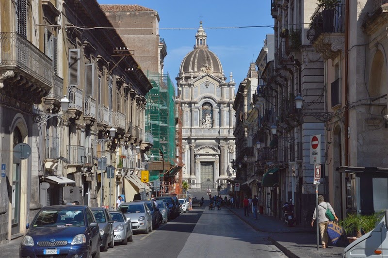 Katania leży u stóp tego maleństwa i cały czas żyje w jej cieniu. W mieście podobnie jak w Noto znajdziemy wiele barokowych elementów, ale ten barok jest zupełnie inny. O ile w Noto kolorystyka była słoneczna to tutaj panuje ciemnoszary wręcz grafitowy nastrój zarówno ulic wyłożonych lawą jak i budynków. Główna ulica miasta Via Emanuele (chyba główna w większości sycylijskich miast ) jest jednocześnie elegancka i surowa.