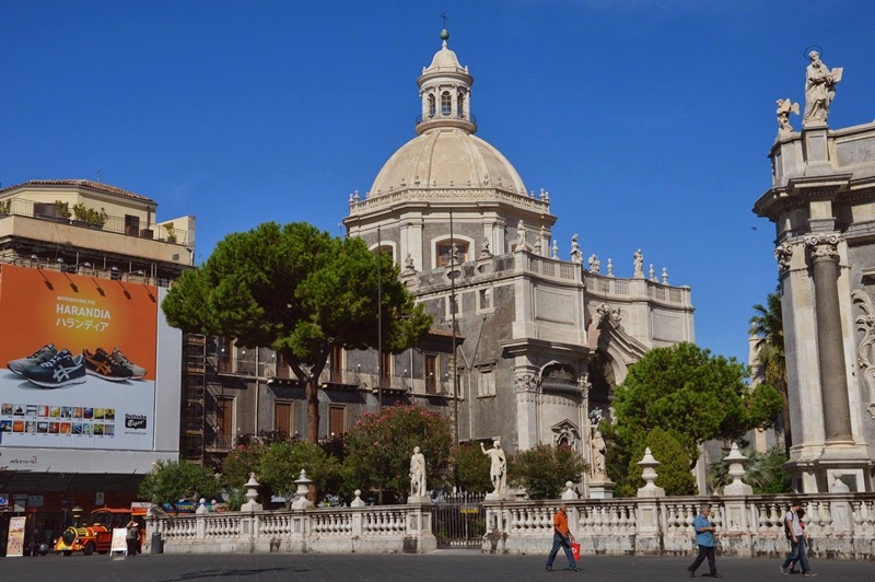 Katania leży u stóp tego maleństwa i cały czas żyje w jej cieniu. W mieście podobnie jak w Noto znajdziemy wiele barokowych elementów, ale ten barok jest zupełnie inny. O ile w Noto kolorystyka była słoneczna to tutaj panuje ciemnoszary wręcz grafitowy nastrój zarówno ulic wyłożonych lawą jak i budynków. Główna ulica miasta Via Emanuele (chyba główna w większości sycylijskich miast ;) ) jest jednocześnie elegancka i surowa.