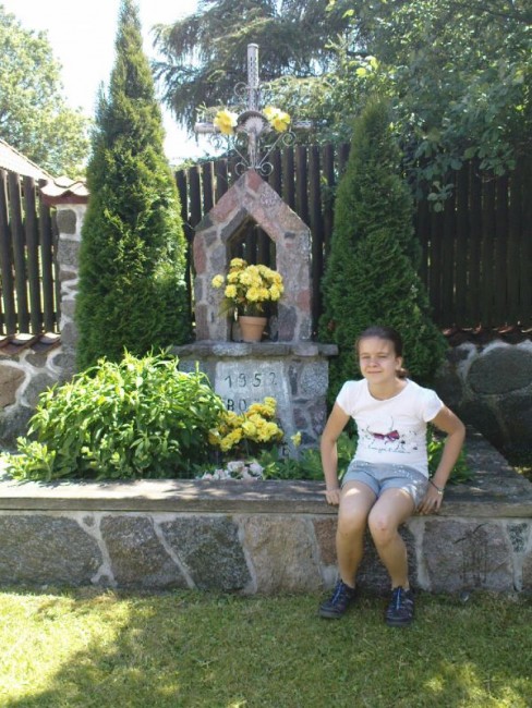 Guty Nowe.jpeg Olcia obok przydrożnej kapliczki w Gutach Nowych. |