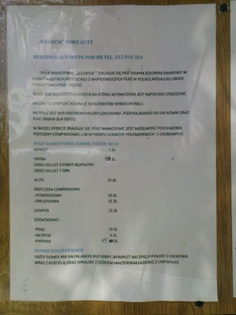 Otóż, już rok temu zniknęło zdewastowane miejsce biwakowania przy drodze Okartowo - Guty Nowe. Nadleśnictwo wynajęło ten teren osobie prywatnej. Wszystko zostało pięknie uporządkowane, ponaprawiane i urządzone. Powstało w ten sposób kolejne tanie pole biwakowe. Do wody prowadzi ścieżka między trzcinami o długości może ok. 100 m. Jednak szeroka. Oczywiście jedynie dla pieszych. Jeżeli chcesz się tylko wykąpać, to przed polem jest płatny parking.