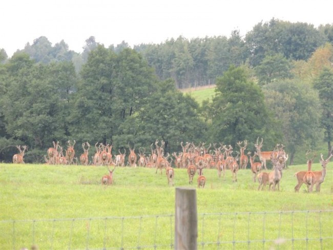 U Pani Jadwigi tak nam się podobało, że aż żal było wyjeżdżać. Dlatego wyruszyliśmy dopiero ok. 14 i już wiedzieliśmy, że nie zobaczymy tego dnia zbyt wiele. Znajomy Pani Jadwigi podpowiedział nam, by wstąpić jeszcze po ser do sklepu firmowego mleczarni w Filipowie (rzeczywiście był bardzo smaczny), a także by kierując się na Węgorzewo, czyli nasz kolejny cel podróży, nie jechać na Gołdap, tylko pojechać skrótem przez Wilkasy. Była to kolejna malownicza trasa, wzdłuż której mijało się małe wioski (choć sama droga wymaga raczej gruntownego remontu), a największą atrakcją była przepotężna ferma... jelenii (!) Na ponad 350 hektarach hodowanych jest tu grubo ponad 1000 sztuk. Niesamowity widok...