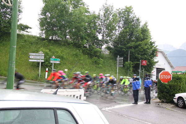 Niestety kolejnego dnia pogoda się psuje i zaczyna padać więc ruszamy dalej. W Corps policja ściąga nas na bok i mówi że do 11.00 droga będzie zamknięta bo jedzie wyścig kolarski. Podczas tego przymusowego postoju podchodzi do nas Niemiecki motocyklista podróżujący z żoną i czekając na kolarzy ucinamy sobie pogawędkę. Dowiadujemy się że wczoraj droga z przełęczy Galibier na Grenoble była zamknięta również z powodu tego wyścigu. Opowiada też o swojej podróży ma 67 lat i jadą jeszcze nad Atlantyk, Lourdes, Pireneje i południowym wybrzeżem wracają do domu, mam czas mówi jestem już emerytem. Wyścig w końcu przejechał ale większe wrażenie zrobiła na nas kolumna towarzysząca. Jedziemy dalej przez Vizille bardzo stromym zjazdem gdzie w 2007 spadł Polski autokar. Droga zamknięta dla autobusów i ciężarówek a dodatkowo każdy wyższy pojazd staje przed szlabanem i jest automatycznie ważony i dopiero wtedy może jechać dalej.