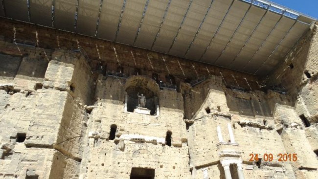 Nad sceną znajduje się 3- metrowy posąg cesarza Oktawiana Augusta