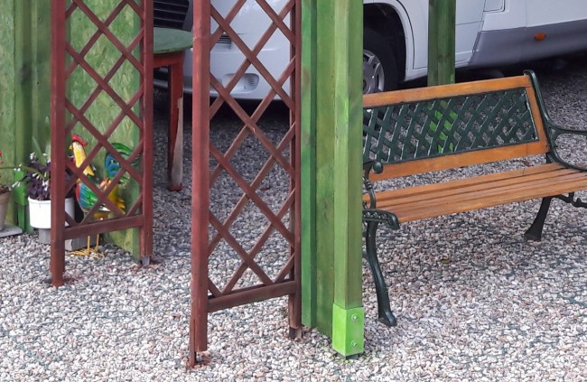 Bardziej ogrodowo wygląda to moje poskładane z resztek "dzieło" . Nie gryzie się z przyrodą i zasłania "to coś" |