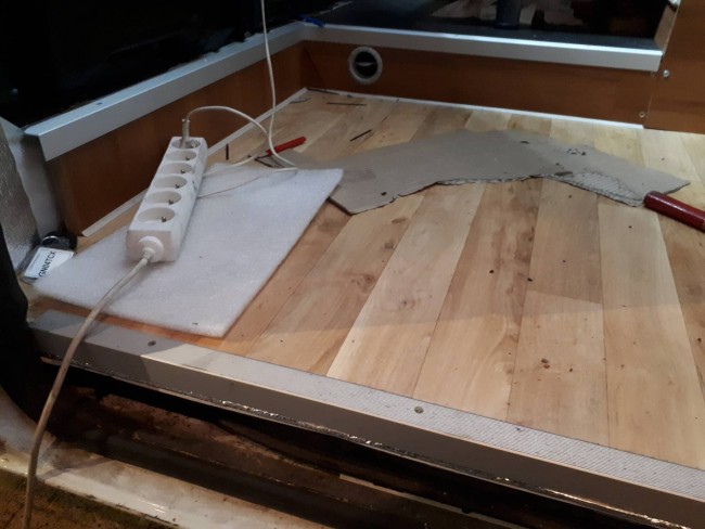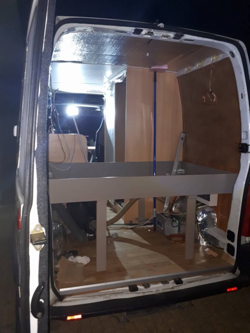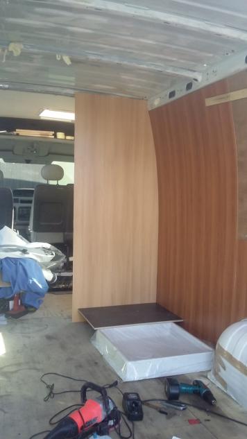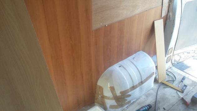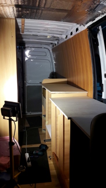 1. Zaizolowana prawa ściana : pianka 1 cm, aluwełna 2 cm + 2x alu bąbelkowe. Na to sklejka 6mm wodoodporna. A na wierzch sklejka kempingowa (z duni.pl) 4 mm.