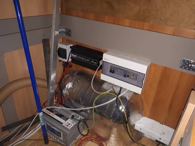 - montaż całej elektryki cz. mieszkalnej (zabezpieczenia, przetwornica 1000W pełen sinus, aku pokładowy, sterownik solara z dodatkowym wyświetlaczem - czeka na montaż