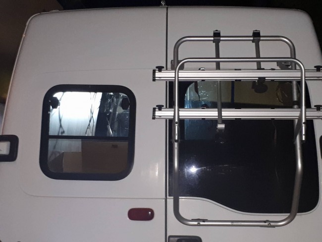 22218107_10154658480226582_1058417308_o.jpg drzwi tylne lewe - okno robione na zamówienie, przesuwne w osi pionowej z ryglem. Bagażnik na 2 rowery zaadaptopwany z Golfa V!!!! |