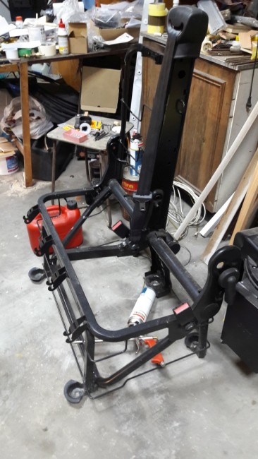 2. Stelaż pod siedzisko główne. Zamiast budowy kanapy od podstaw, kupiłem ławkę podwójną od Mastera 2015 (600 pln), ponieważ ma podnoszone siedziska, a to przydatne pod kątem dostępu do zbiornika, pompy i bufora. Stelaż wymagał przeróbki - wykonania podbudowy z profila zamkniętego 20x30.