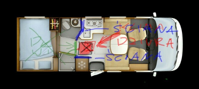 I montuję pomiędzy ścianami. Nad lodówką i trochę przy kiblu. Max do tyłu i w kierunku wyrka nad garażem.