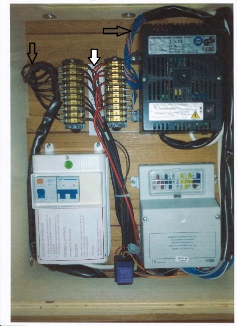 Moi Drodzy. Nie wiam jak, nie wiem kto ale daję słowo, że nie ja wprowadziłem te strzałki i nie ja cokolwiek oznaczyłem na zdjęciu. I tak jestem dumny, że te załączniki się ukazały. Co do skręcenia przewodów, nic nie dotykałem, tak było chyba zrobione w Weinsbergu bo nie czuć tam ręki użytkownika. A dlaczego dwa rzędy bezpieczników, na mękach nie zdradzę, nie wiem dlaczego tak jest, nawet mnie się podoba, że tak uporządkowane to wszystko, ale który do czego kabelek to już nie do mnie. Jedyne co trochę do mnie przemawia to schemat instalacji PC-100 i energobloku DS300. Wydedukowałem, że podłączyli regilator MPPT solara bezpośrednio do śruby A2, a według fabryki powinno być do wtyku oznaczonego "1" w kostce "J05(16)" w energobloku