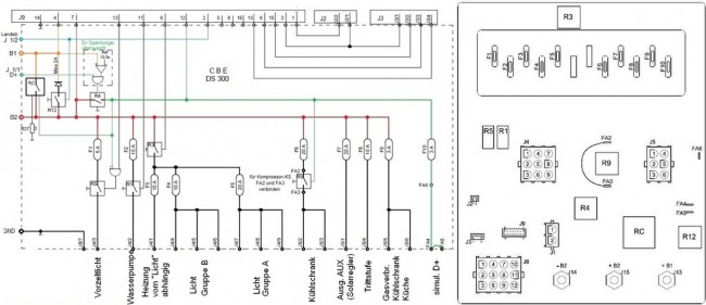 opisanego "dla regulatora solara". Dosyłam znaleziony w internecie schemat blokowy energobloku CBE DS300 (już potrafię dołączać załączniki, oczywiście te mniejsze niż 2 MB). Z tego schematu wynika, że akumulator silnika A1 jest całkowicie (chyba) oddzielony od instalacji i można go ładować prostownikiem a lepiej ładowarką automatyczną, co zrobiłem raz w praktyce nie mając jeszcze żadnych schematów instalacji, a wyłącznie na tz.czuja. Jak widać było to zgodne z przekazanymi dotąd radami kolegów forumowiczów. Przy okazji dzięki za odzew na ten zapoczątkowany temat jak ładować akumulatory kampera. Myślę, że po wyczerpaniu wiedza ta będzie wszystkim pomocna.