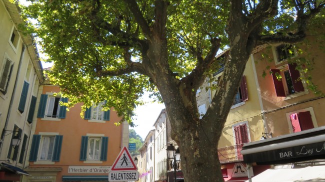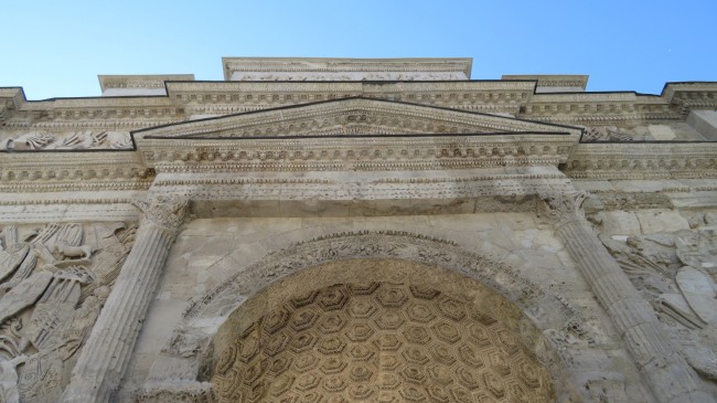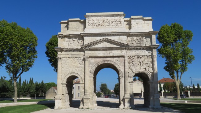 Na chwilę wpadliśmy do Orange. Oczywiście obowiązkowy punkt programu czyli łuk triumfalny. Zalany słońcem, niebieściutkie niebo i 2000 lat historii. To niesamowite że przetrwał te wszystkie zawieruchy i to niektóre jego fragmenty w zaskakująco dobrym stanie. Próbowaliśmy sobie wyobrazić jak wyglądało wtedy jego otoczenie. To trudne. Dzisiaj w cieniu platanów chętnie siadają ludzie żeby coś przekąsić, sporo żywo dyskutującej młodzieży. Parking obok pełny, jakoś się wcisnęliśmy, ale kiedy wróciliśmy tam w porze lunchu (12-14) to było nawet kilka miejsc. Ponieważ zostaliśmy tam trochę przygotowując zapiekankę na kolację to widzieliśmy że Francuzi chyba wyszli z pracy, pojechali do domu coś zjeść, a potem wrócili.