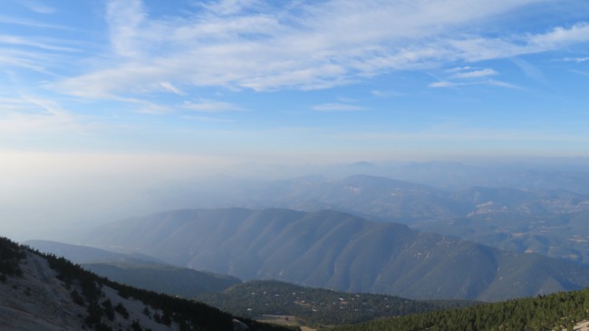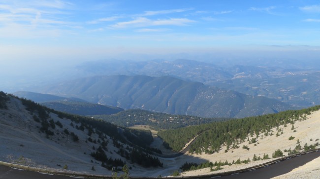 A na koniec dnia drapiemy się na Mont Ventoux. James jest bardzo dzielny! Właściwie większość drogi pokonał na dwójce. Po raz pierwszy poczuliśmy ten wymarzony zapach Prowansji. To coś co trudno opisać ale czego nie da się pomylić z niczym innym. W Polsce też mamy takie miejsca np. Rymanów-Zdrój jestem w stanie rozpoznać z zawiązanymi oczami. Ach! Co za zapach! Oczywiście zupełnie inny ale równie wspaniały. Więc pokonujemy tę górę i rozkoszujemy się wszystkim. Za każdym zakrętem i wraz z wysokością coraz wspanialsze widoki. Przepaść zapiera dech w piersiach. Spotykamy trochę kamperków, motocykli, pojedyncze samochody sportowe (kiedyś ma innej górze wyskoczył nam taki zza zakrętu - piękny!- i jeszcze zdążył przeprosić zanim z rykiem silnika pognał dalej), i mnóstwo rowerów. Podziwiamy tych ludzi. Takie wzniesienia! Lubimy ludzi pozytywnie zakręconych mimo, że sami wolimy spacery.