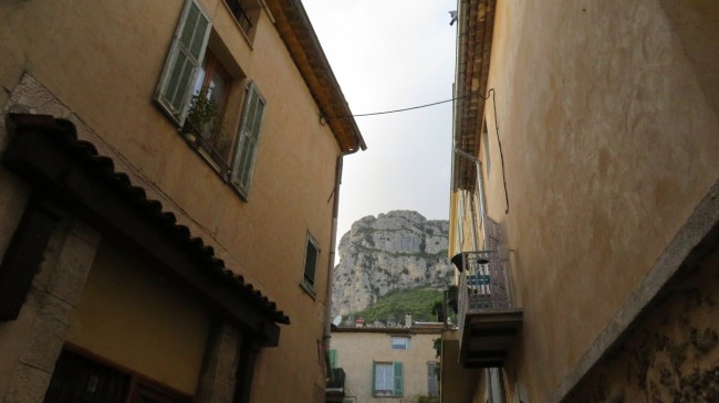 Mój genialny małżonek znajduje miejsce dla Jamesa na noc w tym szalonym miejscu. W Saint-Jeannet. Jest tak ciasno że nawet dla Jamesa trochę za bardzo. Wciskamy się w jedyne wolne miejsce - 5 cm. od samochodu z tyłu, z boków trochę lepiej. Ale...za chwilę ktoś odjeżdża. Idę zająć miejsce. Nad nami wprawdzie będą spały gołębie a James dwa dni temu się kąpał w pianie, ale wybaczymy im ewentualne "prezenty". Z dwóch powodów -po pierwsze śpimy w genialnym miejscu pod wiszącą skałą (no prawie) a po drugie niedaleko trafiamy na zadbany gołębnik z tablicą z narodowymi flagami i uhonorowaniem tych ptaków za ich zasługi podczas I Wojny Światowej kiedy ratowały żołnierzy przenosząc wiadomości w beznadziejnej sytuacji.
