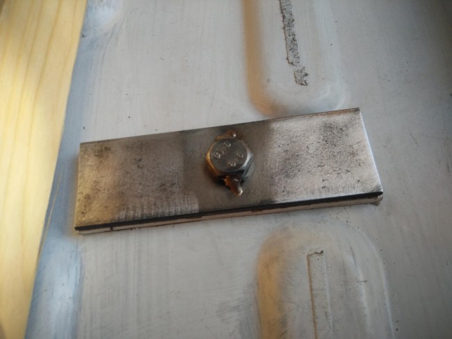 Śrubę należy przełożyć przez otwór w płaskowniku i przyspawać żeby się śruba nie miała jak obracać, od biedy można też użyć dwuskładnikowego kleju epoxy, jak się dużo da to też powinno powstrzymać śrubę przed obracaniem.