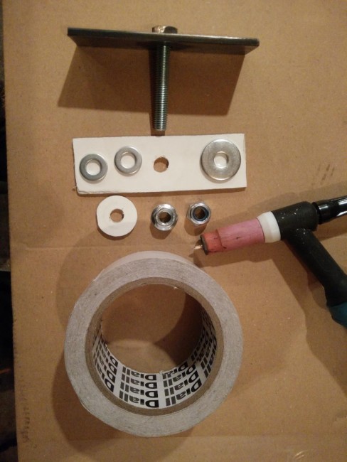 Wymyśliłem sobie więc taki patent jak na zdjęciach, składa się z kawałka płaskownika, śruby, podkładek, nakrętek, taśmy dwustronnej i kawałka spienionego pcv.