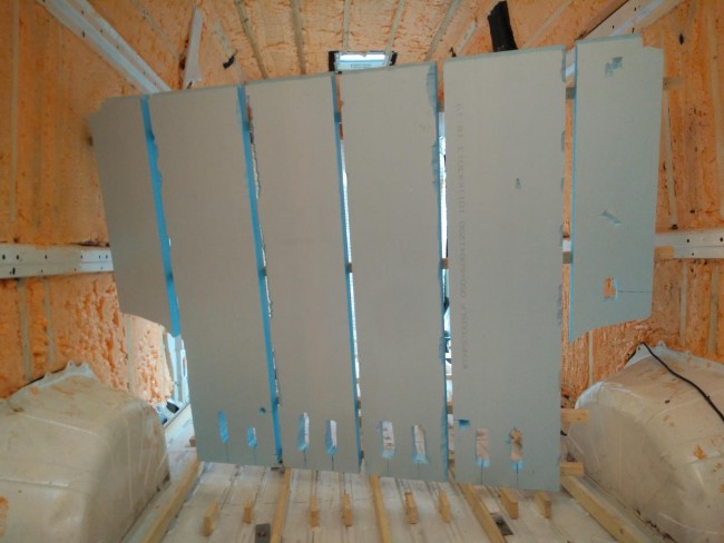 Ważne było dokładne ułożenie płyt pomiędzy listwami w taki sposób żeby powierzchnia płyt była na tej samej wysokości co listwy podłogowe, po to żeby po sklejka podłogowa dokładnie przylegała. Każda nierówność niestety spowoduje że sklejka będzie się uginać przy chodzeniu.