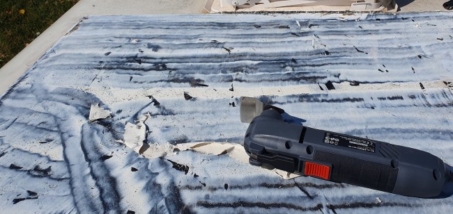 Pierwsze próby oderwania panelu od dachu, delikatnie mówiąc, lekko mnie przeraziły. To cholerstwo, niczym nie można oderwać. Podciąłem trochę nożem, a potem przy pomocy młotka i drewnianej listwy z twardego drewna, zaostrzonej na kształt szerokiego przecinaka, dość sprawnie oderwałem toto od dachu. Drugi kryzys przyszedł przy próbie usunięcia kleju, a kleju, montując, żem nie żałował. Werdykt, trzeba będzie z tym czymś na dachu zaprzyjaźnić się, albo, przez rok, w wolnych chwilach, po trochu, skubać.