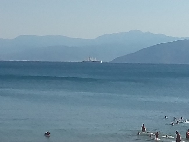 Właśnie przepłynął 4 masztowiec częściowo na żaglach. Rzadki widok. Nie udało się zrobić lepszego zdjęcia ale przez lornetkę piękny widok.