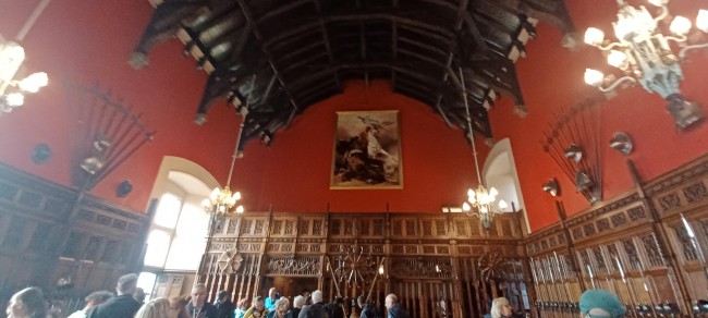 Następnie udajemy się na Crown Square, który jest otoczony różnymi budowlami. Do jednej z nich - Pałacu Królewskiego wije się trasą wytyczoną linami dość długa kolejka chętnych do wejścia. Powodem jest możliwość obejrzenia szkockich insygniów koronacyjnych. Stajemy i my. W ciągu kilkusekundowego przejścia oglądamy zamknięte w gablocie berło, koronę i miecz, oczywiście bez możliwości zrobienia zdjęć. Potem zaglądamy przez drzwi do pokoju narodzin, gdzie Maria Stuart urodziła syna, późniejszego króla Szkocji i Anglii Jakuba VI. Na ścianie w holu podziwiamy bardzo ciekawy eksponat jakim są repliki 37 haftów wydzierganych przez Marię Stuart podczas wygnania.