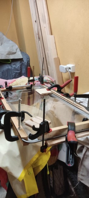 Bardzo ważne przy klejeniu takiej szyby, aby zrobić ramę w której umieszczamy szybę po obwodzie, a jeszcze ważniejsze aby była idealnie płaska, aby się nie zrobiło "śmigło".