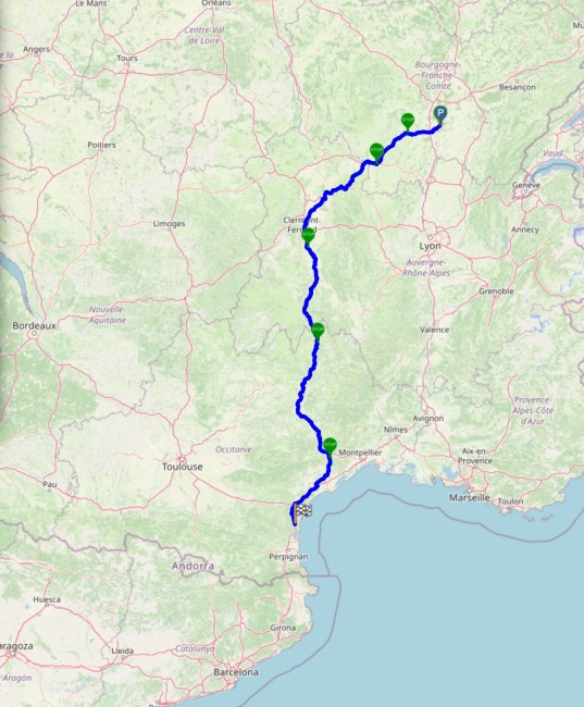17.11 Najszybszą i najwygodniejszą trasą w kierunku Hiszpanii jest dojazd do Clermont Ferrant i dalej A75 (bezpłatna) do Beziers. Jazdę można kontynuować A9(płatną) przechodzącą w E15 bezpłatną po stronę hiszpańskiej. A75 przechodzi przez góry i dzisiaj przy zachmurzeniu, opadach i mgle jechało się przez jakiś czas trudniej. Za Wiaduktem Milau pogoda zaczęła się poprawiać i z 3st temperatura skoczyła do 19 w okolicach Beziers, wydaje się, że ucieklismy od chłodu. Na trasie staram się zatrzymywać na noc w nowych miejscach. Teraz też przymierzałem się do miejscówki w okolicach Narbony, ale jak już tu dotarliśmy to nie mogliśmy się powstrzymać i kolejny raz dojechaliśmy do naszej ulubionej "karaibskiej plaży" w La Barcares 42.78663 3.037973. Od jutra trasy będą krótsze i zaczynamy hiszpańskie wakacje zimową porą.