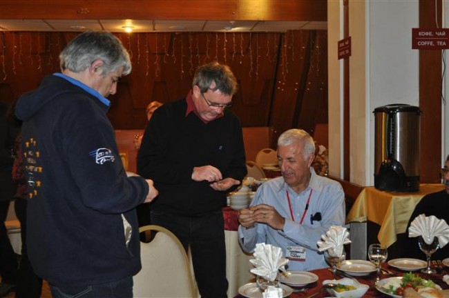 Z Suzdala wyjechaliśmy po obiedzie, około 17 czasu Moskiewskiego. Wcześniej zrobiliśmy grupowe zdjęcie całej międzynarodowej braci. Dojeżdżaliśmy do Moskwy było już ciemno. Z za szyb autokaru widać było skąpo ośnieżoną za to rzęsiście oświetloną stolicę Rosji. Dziesiątki świetlistych choinek na moskiewskich placach przypominała, że za moment będą Święta. Autokar podjechał pod hotel Kosmos. Z zewnątrz robi wrażenie, szczególnie ściana z neonem i limuzyny dla hotelowych gości. Na parkingu stoi kilkanaście kamperów z wypożyczalni "Jachty na kołach" Recepcja i hotelowe sklepiki przyciągają uwagę. Pokoje trochę widać, że czasy świetności już maja za sobą. Zostawiamy bagaże w pokojach i idziemy na szybką kolację. Plany na wieczór jeszcze dosyć bogate. "Moskwa by night".
