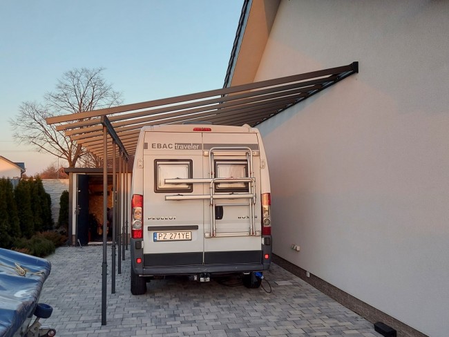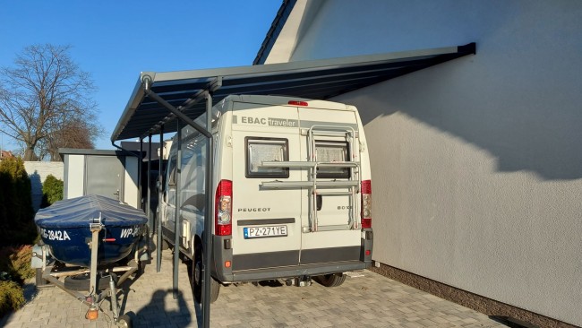 Wreszcie kamper ma dom. Wiata gotowa. Jest woda, prąd, miejsce do zlania szarej wody i wylania kota. Temat zamknięty.