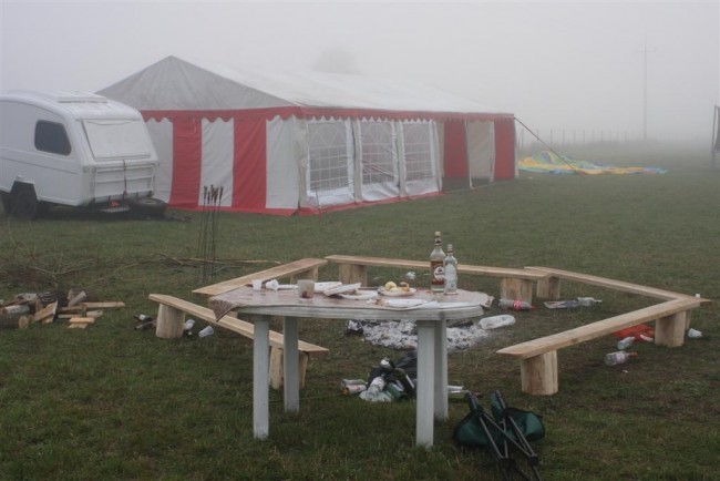 Wieczorem dojeżdżają kuzyni na piwko. Pijemy piwko wspominamy stare czasy z miasteczka słychać odgłosy festynu. Coś słyszę, chyba młodym do namiotu dobiera się jakiś kot. Jest dość chłodno, piwo działa bardzo wolno, wstaję, idę, zobaczyć co to. O kurczę tego bym się w życiu nie spodziewał.ROBIĘ HAŁAS młodzież poszła na festyn ja zostałem z żoną, oraz kuzyn z żoną. Obsługi już nie ma. CO ROBIĆ????????????????????? Niestety fotek z tej akcji nie będzie, nikomu by nie wpadło do głowy w takiej chwili szukać aparatu. Okazało się że to nie kot, tylko stado dzików ,prawie dorosłych w ilości 8 szt, na moje oko po 80kg. Całe szczęście, gdy mnie zobaczyły uciekły w popłochu i nie musiałem ja uciekać .Następnego dnia dowiedziałem się, że to stado przyzwyczajone do turystów i jak przyjdą następnym razem trzeba dać im rózgą po dupie. Szkoda że dowiedziałem się po fakcie ,co przeżyłem to moje.