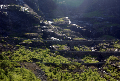 Na Drodze Orłów pogoda zmienia się diametrycznie. Pada deszcz, ślisko. Ruch żaden. Czasami gdzieś stojący między skałami kamper. Krajobraz przypomina obrazy z filmu Pamiętnik znaleziony w Saragossie. Wszędzie wielkie płaty śniegu nierzadko sięgające skraju drogi. I to śniegu o metrowej grubości. Na jeziorze Djupvatnet zadziwia leżący śnieg w lipcu.