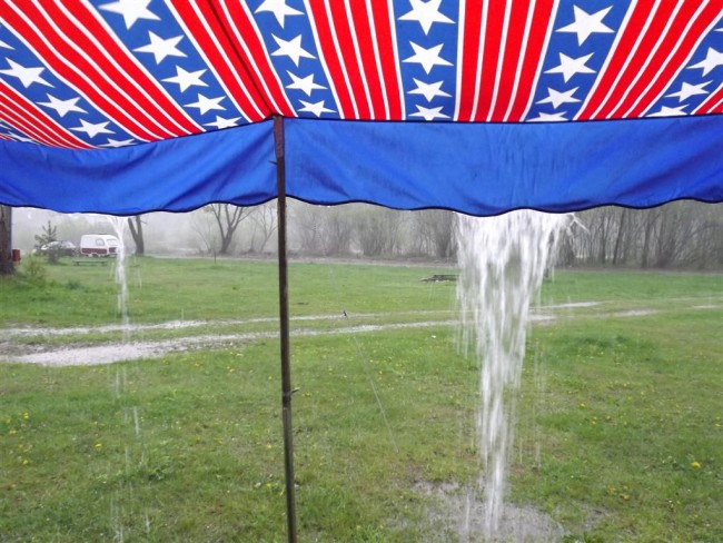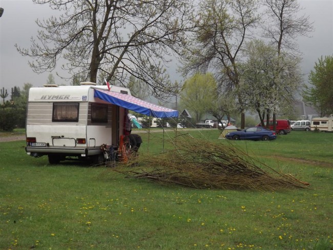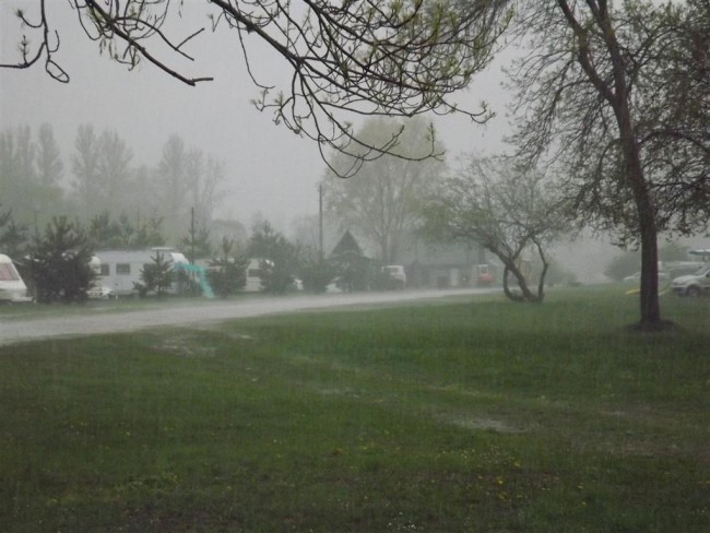 Po wszystkim poszliśmy ocenić skale zniszczeń. Drzewa które wcześniej mialy białe kwiaty już ich nie miały a pod każdym były połamany gałęzie i konary. Przedsionek w jednej przyczepie poleciał na dach i szczelnie ją okrył. Jedna markiza w kamperze też nie wytrzymała ( inni swoje pozamykali ) i połamała się. Nic śmiesznego. Szybki wypad do centrum, huśtawki, lody, piwo i ... znowu leje. I tak z przerwami do wieczora. Rano siedzieliśmy w samych majtkach , wieczorem przy grilu w czapkach i kurtkach . Ocieplenie klimatu ... jego mać ...